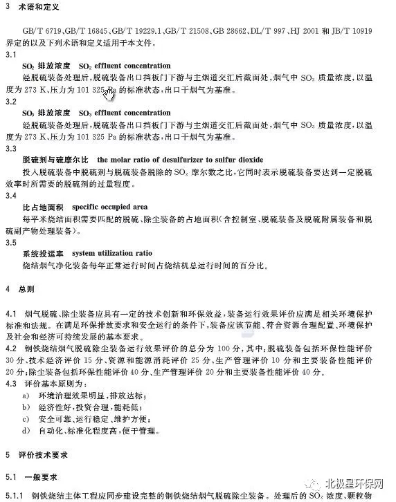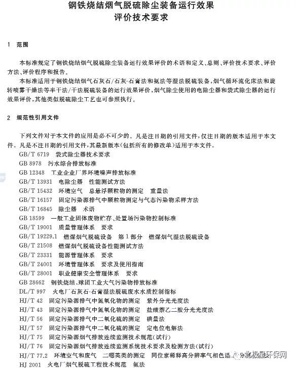 該《標準》適用于鋼鐵燒結(jié)煙氣石灰石/石灰-石膏法和氨法等式濕法脫硫裝備,煙氣循環(huán)流化床法和旋轉(zhuǎn)噴霧干燥法等半干法/干法脫硫裝備的運行效果評價,煙氣除塵使用的電除塵和袋式除塵器的運行效果評價,其他類似脫硫除塵工藝也可參照執(zhí)行。