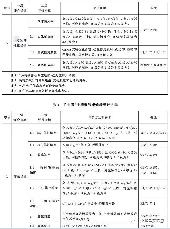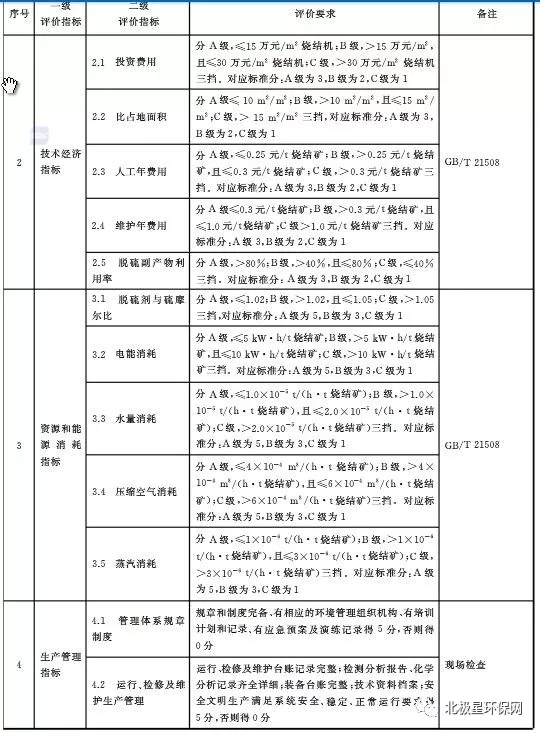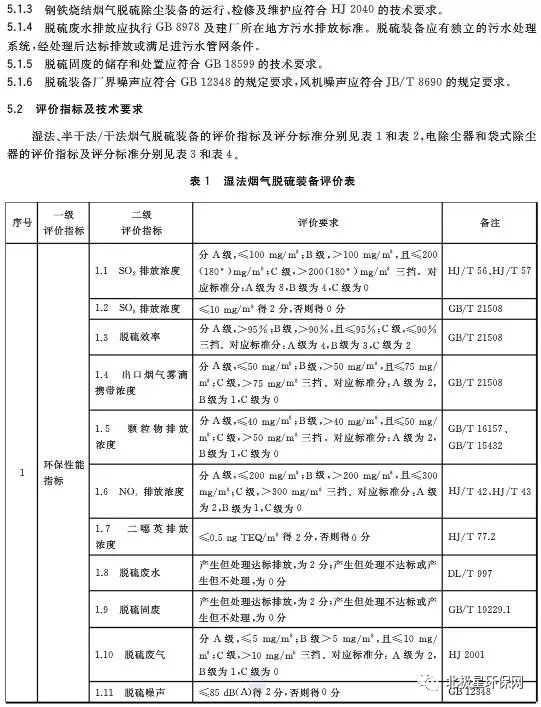 日前,中華人民共和國國家質(zhì)量監(jiān)督檢驗檢疫總局、中國國家標準化管理委員會發(fā)布《鋼鐵燒結(jié)煙氣脫硫除塵裝備運行效果評價技術(shù)要求GB/T 34607-2017  》。根據(jù)標準要求,鋼鐵燒結(jié)煙氣脫硫除塵裝備運行效果評價總分為100分,其中:脫硫裝備包括環(huán)保性能評價30分,技術(shù)經(jīng)濟評價15分,資源和能源消耗評價25分、生產(chǎn)管理評價10分和主要裝備性能評價20分;除塵裝備包括環(huán)保性能評價40分,生產(chǎn)管理評價20分和主要裝備性能評價40分。濕法脫硫性能指標包括SO2排放濃度、SO3排放濃度、脫硫效率、霧滴濃度、顆粒物排放濃度、NOx濃度、二惡英濃度等,詳見表1。半干法/干法脫硫性能指標包括SO2排放濃度、SO3排放濃度、脫硫效率、顆粒物排放濃度、NOx濃度、二惡英濃度等,詳見表2。電除塵、袋除塵主要性能指標包括顆粒物濃度、去除率、本體漏風(fēng)率、壓力降等,詳見表3、4。